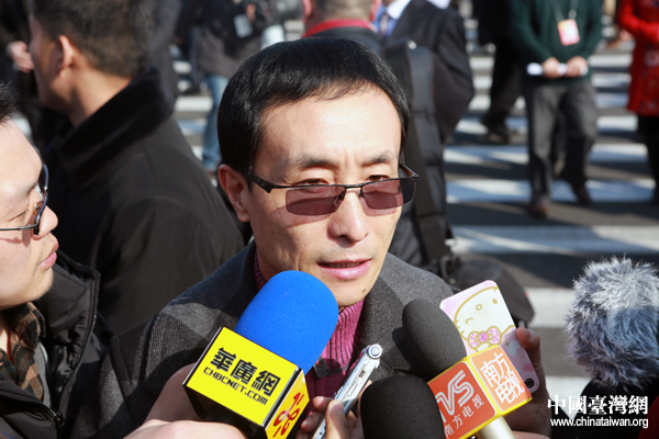 開(kāi)幕會(huì)舉行前,政協(xié)委員黃宏在人民大會(huì)堂前遭遇各路記者圍追堵截。(中國(guó)臺(tái)灣網(wǎng) 于斯文 攝)