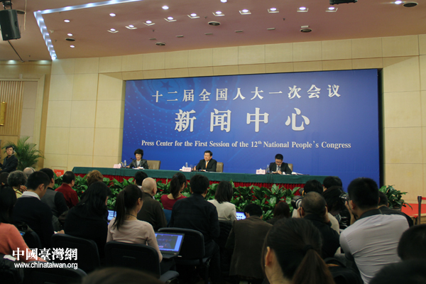 十二屆全國人大一次會議8日上午在梅地亞中心舉行記者會,商務(wù)部部長陳德銘就“發(fā)展國內(nèi)外貿(mào)易和促進(jìn)經(jīng)濟(jì)合作”的相關(guān)問題回答了中外記者提問。( 中國臺灣網(wǎng) 楊麗 攝)