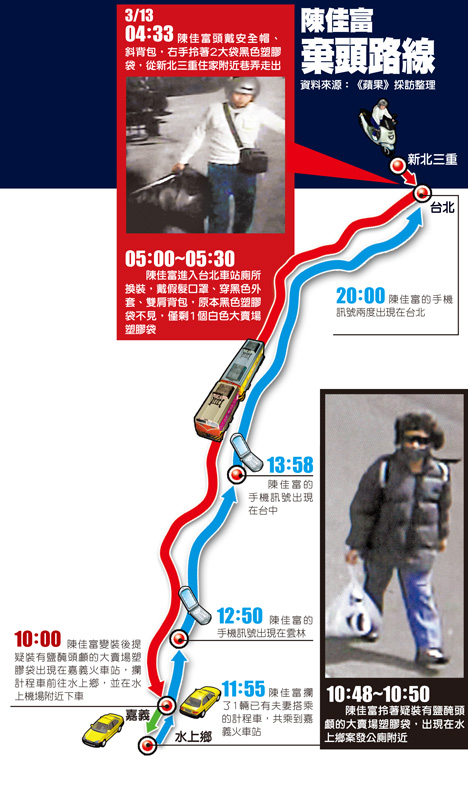 檢警昨表示,經(jīng)調(diào)閱臺北車站監(jiān)視畫面,13日凌晨4時,陳佳富拎著兩大袋黑色塑料袋外出,隨后在臺北車站現(xiàn)身,再進(jìn)入車站廁所換裝,走出時已戴假發(fā)與口罩、穿上黑色厚重外套、雙肩背包變裝,手上兩個黑色塑料袋消失不見,右手僅拎著一個白色大賣場塑料袋,與嘉義公廁的監(jiān)視影像相符。此外,監(jiān)視器也拍下他以上述裝扮,站在臺鐵第3月臺候車,搭乘清晨列車南下,上午約10時出現(xiàn)在嘉義縣,證實(shí)他搭火車帶著頭顱到水上鄉(xiāng)丟棄。