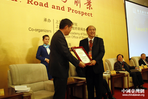 第二屆“世界中國學貢獻獎”在23日第五屆中國學論壇開幕式上揭曉。國務院新聞辦公室副主任、國家互聯(lián)網(wǎng)信息辦公副主任錢小芊(右一)、上海市人民政府副市長翁鐵慧(左二)為獲獎者代表頒獎。(中國臺灣網(wǎng) 張潔 攝)