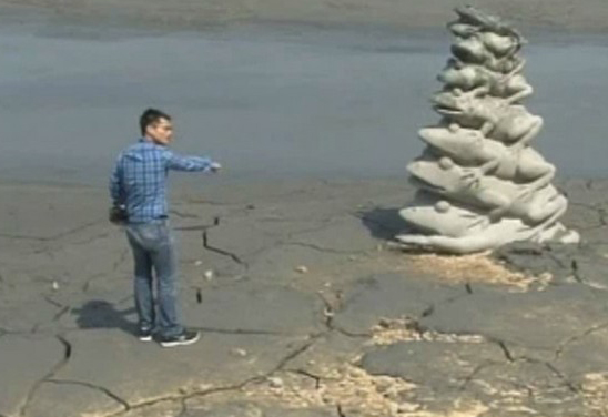 9只青蛙疊在一起,各有不同表情和姿態(tài),2001年完工后成了新興景點,4米高的九蛙疊像長期泡在水里,隨著水位高低,最頂端兩只不時探出頭來,只是近半個月水位驟降,意外讓9蛙全部露臉。