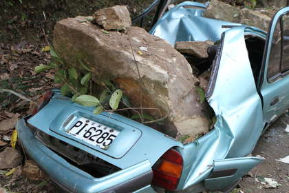 林姓男車子在南投草屯雙冬山區(qū)被滾石砸中。圖片來自臺灣媒體