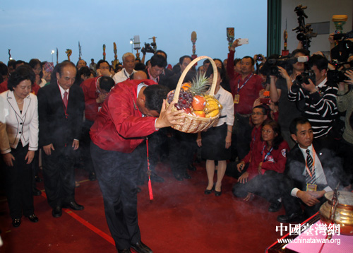 臺(tái)灣鴻海科技集團(tuán)董事長(zhǎng)郭臺(tái)銘敬獻(xiàn)果籃(中國(guó)臺(tái)灣網(wǎng) 李典典 攝)
