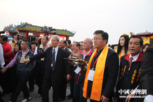 中華道教關(guān)圣帝君弘道協(xié)會(huì)總會(huì)長(zhǎng)陳展松恭迎香爐(中國(guó)臺(tái)灣網(wǎng) 李典典 攝)