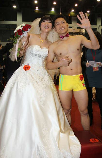 中國臺(tái)灣網(wǎng)3月31日消息 據(jù)臺(tái)灣媒體報(bào)道,臺(tái)北市民政局今天在臺(tái)北體育館舉辦今年首場聯(lián)合婚禮,共有38對新人參加,現(xiàn)場彌漫著幸福浪漫,全場最吸睛的新人,是擔(dān)任游泳教練的體育老師陳瑞辰,穿上鮮黃色四角泳褲,牽著身穿白紗的老婆步入會(huì)場,腹肌明顯精壯的好身材,引發(fā)在場觀禮家屬一陣驚呼、歡聲雷動(dòng),人魚線若隱若現(xiàn),民眾直呼太可惜,“穿三角褲看得比較清楚”。