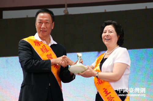 中共山西省委常委、宣傳部部長胡蘇平與郭臺銘互贈禮物。(中國臺灣網(wǎng) 李典典 攝)