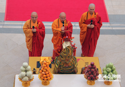 臺(tái)灣佛光山寺住持心保和尚恭讀星云法師《為社會(huì)大眾祈愿文》。(中國(guó)臺(tái)灣網(wǎng) 李典典 攝)