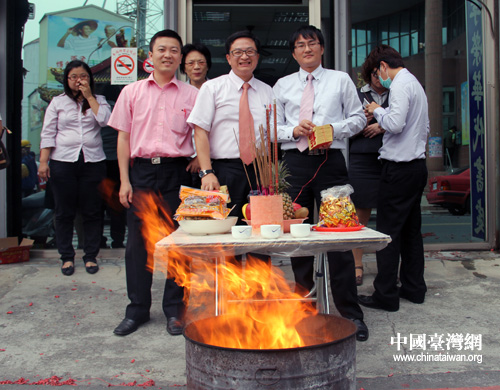 臺南鹽水鎮(zhèn)某保險公司的職員祭拜關(guān)公祖廟圣像。(中國臺灣網(wǎng) 李典典 攝)