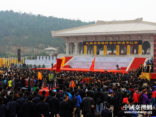 中國臺(tái)灣網(wǎng)4月4日黃陵消息 4月4日上午癸巳年(2013)清明公祭軒轅黃帝典禮在陜西黃陵縣舉行,萬余名海內(nèi)外中華兒女聚首陜西省黃陵縣橋山軒轅殿祭祀廣場(chǎng),追念初祖功德,表達(dá)追思之情。