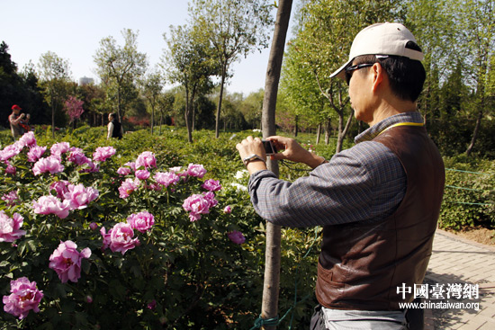 臺(tái)灣嘉賓沉迷于國(guó)色天香的牡丹花叢中。(中國(guó)臺(tái)灣網(wǎng) 李丹 攝)