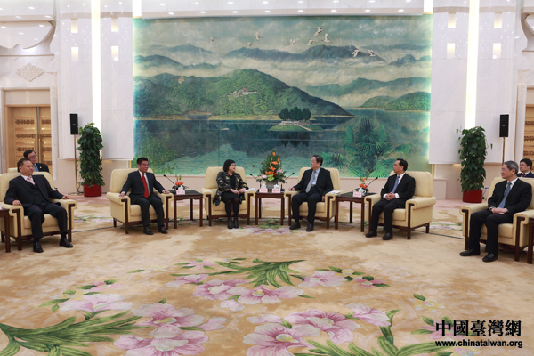 中共中央政治局常委、全國政協(xié)主席俞正聲17日上午在北京人民大會堂會見了出席“2013海峽兩岸工會論壇”的臺灣工會界主要代表。圖左為海峽兩岸勞工發(fā)展交流協(xié)會理事長侯彩鳳。(中國臺灣網(wǎng) 于斯文 攝)