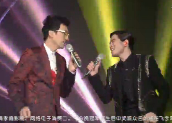 4月12日在湖南衛(wèi)視我是歌手總決賽中,林志炫與蕭敬騰在“幫幫唱”環(huán)節(jié)的合唱。(圖片來源:電視畫面截圖)