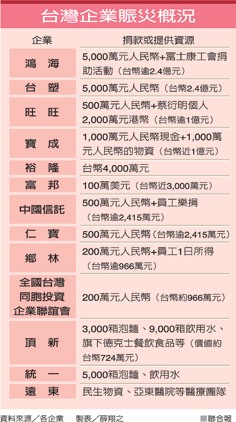 臺(tái)灣企業(yè)賑災(zāi)概況。圖片來源:臺(tái)灣《聯(lián)合報(bào)》