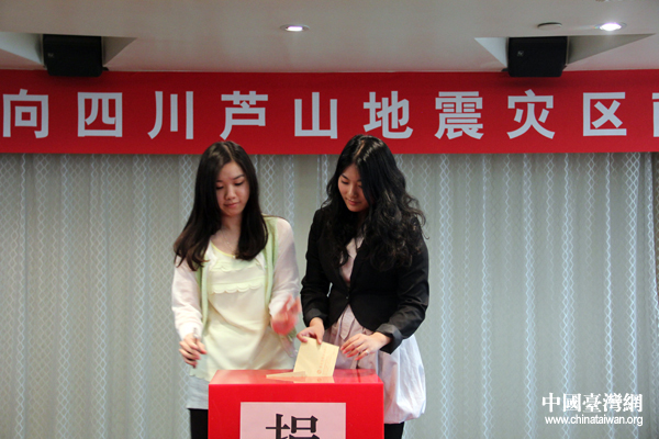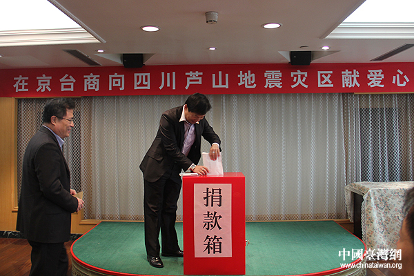 北京市臺(tái)資企業(yè)協(xié)會(huì)23日上午舉行獻(xiàn)愛心活動(dòng),向四川蘆山地震災(zāi)區(qū)的同胞捐贈(zèng)救災(zāi)款項(xiàng)。(中國臺(tái)灣網(wǎng) 楊麗 攝)