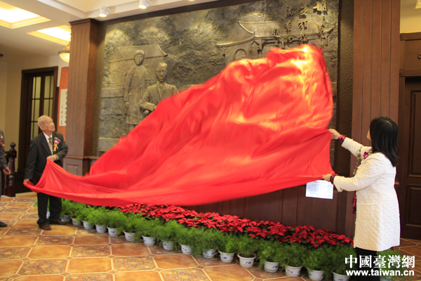 “林獻堂抗日事跡陳列館”暨北京五桂樓會館開館儀式4月28日在北京臺灣街五桂樓舉行。圖為梁啟超之子梁思禮、林獻堂孫媳林芳媖為“梁啟超與林獻堂浮雕”揭幕。(中國臺灣網(wǎng) 何建峰 攝)