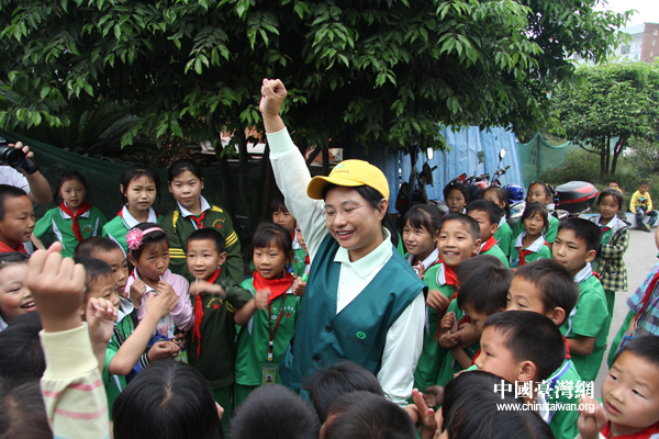 頂新公益基金會副秘書長周淑禎帶領(lǐng)普安小學(xué)的孩子們做游戲(中國臺灣網(wǎng) 李徽 攝)