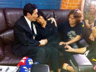 馬英九(左)12日下午渡海探視慰問遭菲律賓射殺中彈身亡的洪石成家屬。圖片來源:臺灣“中央社”