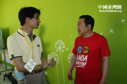 來自臺灣的鄭近富先生與黃莊學(xué)校校長交流學(xué)生教育問題。(中國臺灣網(wǎng) 郭瑩瑩 攝)