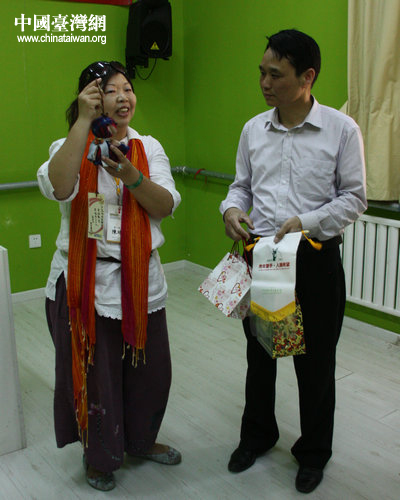 陳培綸女士向陳校長贈送由臺灣學(xué)生手工制作的娃娃。(中國臺灣網(wǎng) 郭瑩瑩 攝)