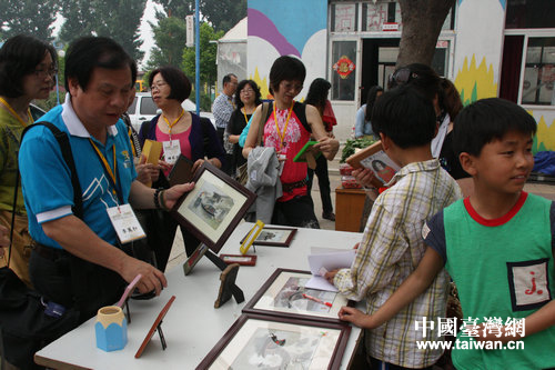 臺(tái)灣參訪團(tuán)成員在欣賞孩子們的畫作。(中國(guó)臺(tái)灣網(wǎng) 郭瑩瑩 攝)