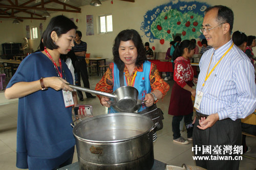 林彩媚團(tuán)長(zhǎng)(左)與參訪團(tuán)成員一起享用孩子們親手做的午餐。(中國(guó)臺(tái)灣網(wǎng) 郭瑩瑩 攝)