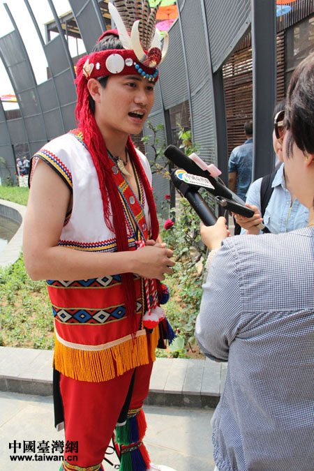 園博臺灣園里,阿美族小伙對記者唱起了民族歌曲。(中國臺灣網(wǎng) 黃艷艷 攝)