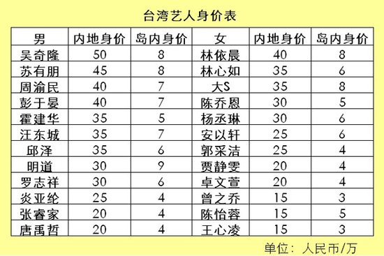 臺(tái)灣藝人身價(jià)表。(圖片來(lái)自網(wǎng)絡(luò))