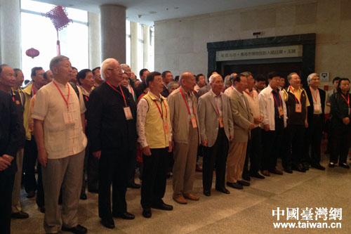 兩岸退役將軍及書畫家在作品前合影留念。(中國臺(tái)灣網(wǎng) 張潔 攝)