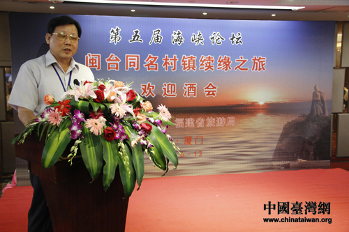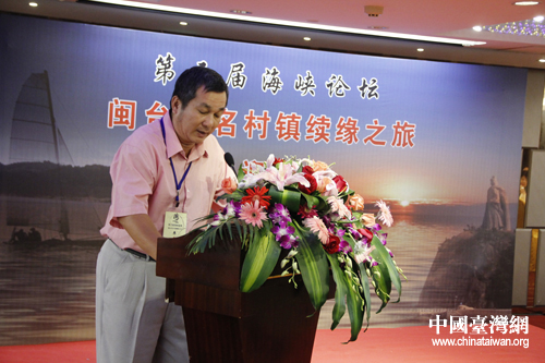 來(lái)自臺(tái)灣臺(tái)南市安平區(qū)的里長(zhǎng)傅建峰在“閩臺(tái)同名鄉(xiāng)鎮(zhèn)續(xù)緣之旅啟動(dòng)儀式”上致詞(中國(guó)臺(tái)灣網(wǎng)記者 蕪?fù)?nbsp;攝)