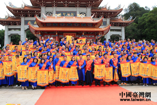 臺灣179家媽祖宮廟信眾代表與媽祖祭祀大典主祭人合影。(中國臺灣網(wǎng) 樊玉嬌 攝)