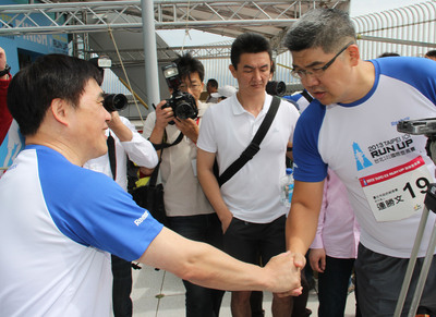 臺(tái)北101大樓國際登高賽5日舉行,臺(tái)北市經(jīng)發(fā)會(huì)副召集人連勝文(右)擔(dān)任臺(tái)北市府第19棒,并交棒給臺(tái)北市長郝龍斌(左)。圖為賽后2人握手致意。(圖片來自臺(tái)媒)
