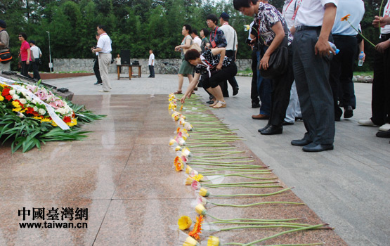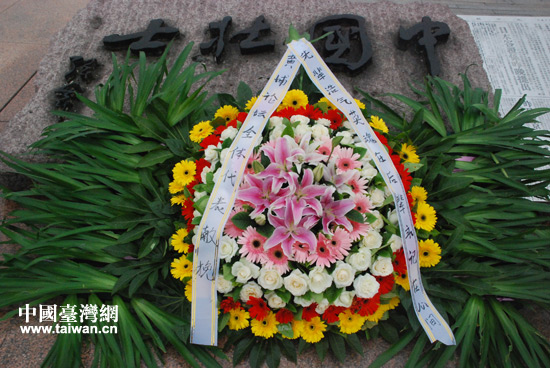 6月17日上午,在中國壯士群雕廣場(chǎng),兩岸的黃埔親屬、黃埔代表一起,為抗戰(zhàn)英烈雕像敬獻(xiàn)了花環(huán)。(中國臺(tái)灣網(wǎng) 李丹 攝)