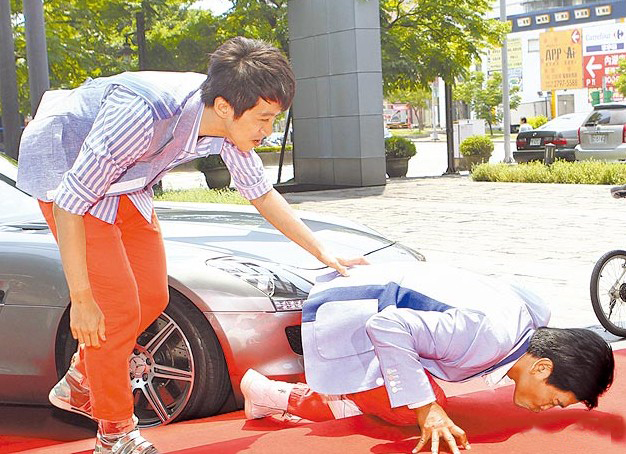 吳宗憲昨一下車就跪吻紅毯,笑翻所有人。左為陳漢典。(圖片來(lái)自臺(tái)媒)