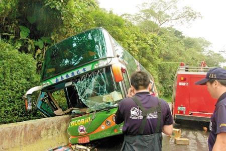 游覽車時速為60公里,駕駛明顯超速,擦撞后車體傾斜45度。(圖片來自臺灣《中國時報》)