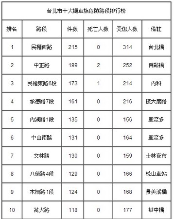 在十大危險路段中,最危險的要數(shù)民權西路,此路段銜接臺北大橋至新北市,為上班族上下班的必經(jīng)要道,非常容易因人員擁擠致使發(fā)生交通事故,而中正路銜接百齡橋至新北市,也因路段人流量高致使出事幾率增加,此外,其它路段則因為臨近重要場所或車流量高而事發(fā)頻繁。