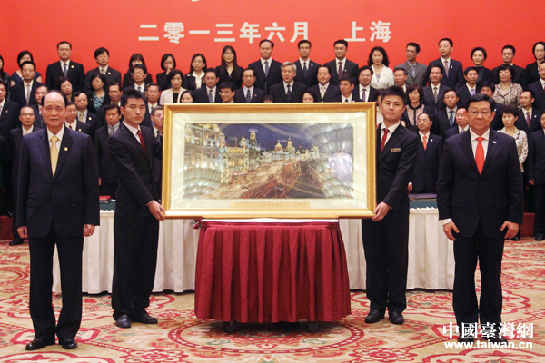 海協(xié)會(huì)會(huì)長(zhǎng)陳德銘向臺(tái)灣;鶗(huì)董事長(zhǎng)林中森贈(zèng)送禮物。(中國(guó)臺(tái)灣網(wǎng) 于斯文 攝)