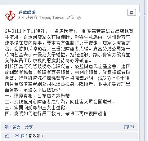 中國(guó)臺(tái)灣網(wǎng)6月24日消息 據(jù)臺(tái)灣媒體報(bào)道,一名罹患唐氏癥的女子因先天缺陷,到臺(tái)灣麥當(dāng)勞購(gòu)買冰淇淋,竟遭店家謊稱有“流浪漢鬧場(chǎng)”,報(bào)警要求趕人。臺(tái)灣麥當(dāng)勞方面的處理態(tài)度一變?cè)僮儯?4日,盡管麥當(dāng)勞公關(guān)人員再度道歉,仍有身心障礙團(tuán)體決定前往麥當(dāng)勞臺(tái)灣總部抗議,并吁請(qǐng)總經(jīng)理正式出面道歉。