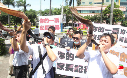 臺灣反12年教育政策團體到“立法院”,以吹號角形式抗議。(圖片來自臺媒)