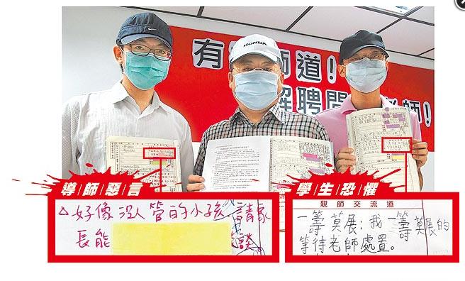 昨天3名家長在人本基金會(huì)陪同下開記者會(huì),但3人怕身分曝光影響小孩,全程戴口罩,他們自嘲:“很沒種!學(xué)期結(jié)束才敢開記者會(huì)!3人列舉廖姓男導(dǎo)師諸多不當(dāng)管教實(shí)例,包括在家庭聯(lián)絡(luò)簿上稱學(xué)生“好像沒人管的小孩”、罵學(xué)生“過動(dòng)兒、吃藥了沒?”當(dāng)學(xué)生面前罵學(xué)生的媽媽是“白癡”等!