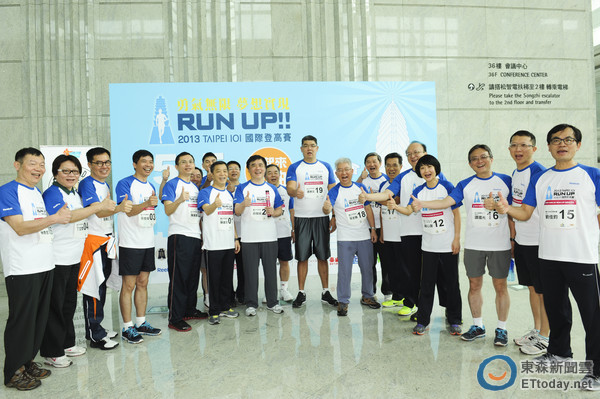 臺北101登高賽,由連勝文(中)交棒給市長郝龍斌,意外成為媒體焦點(diǎn)。(圖片來源:臺北市政府)
