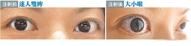 吳太太說,做完療程后她遵從醫(yī)師囑咐,4小時內不敢躺下、碰臉,之后洗臉也特別注意不按壓施打處,不料3天后左眼眼皮逐漸下垂,一周后雙眼變成大小眼,臉部肌肉完全放松時,左眼皮下垂到像整片蓋下,若用力撐開雙眼,右眼又睜大得像在瞪人,看起來很怪異,她嚇得趕緊回診求救,醫(yī)師幫她補打一針肉毒桿菌并提供舒緩藥劑眼藥水,但狀況并未改善。