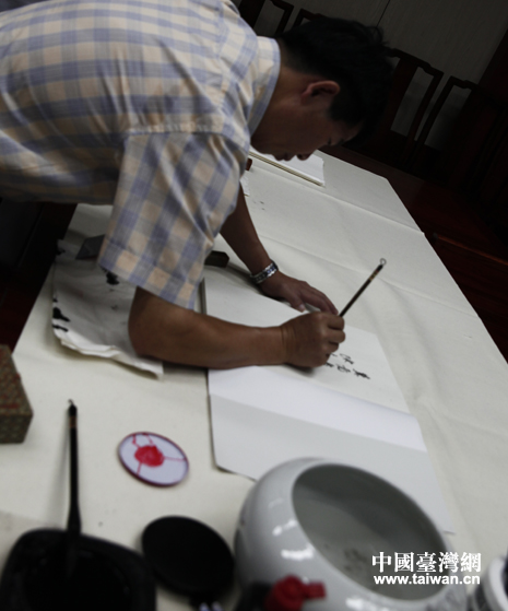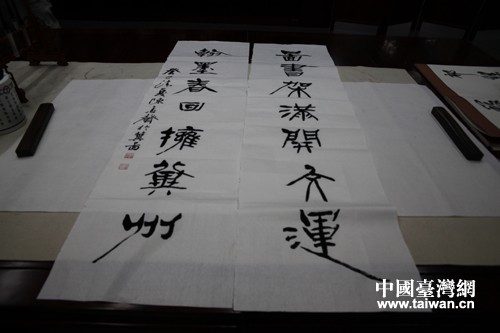 臺(tái)中市政府參事兼主任、勤益大學(xué)文創(chuàng)系助理教授更是在河北省圖書(shū)館揮毫潑墨,留下“圖書(shū)架滿開(kāi)大運(yùn) 翰墨春回?fù)砑街荨保。ㄖ袊?guó)臺(tái)灣網(wǎng) 高斯斯 攝)