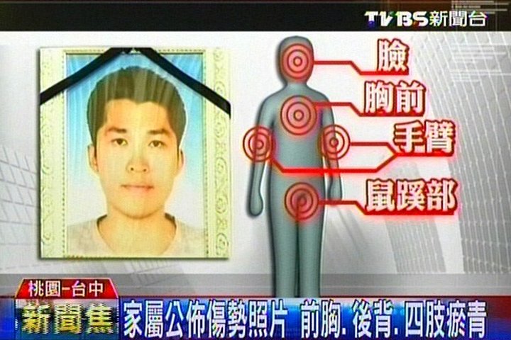 中國臺灣網(wǎng)7月10日消息 據(jù)臺灣TVBS電視臺報道,臺陸軍下士洪仲丘,退伍前3天在軍中暴斃,臺軍方稱是關(guān)禁閉時體能訓練導(dǎo)致熱衰竭死亡。而臺當局防務(wù)主管部門出示的相驗尸體證明書,寫的為“意外死”,死亡原因是“熱性傷害”和“體能訓練”導(dǎo)致多重器官衰竭,家屬公布洪仲丘的傷勢照片,全身瘀青,質(zhì)疑臺軍施虐。