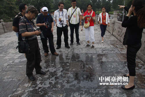 參加“情系燕趙”活動(dòng)的臺(tái)灣文化界人士“研究”趙州橋上柴王爺留下的“車轍”(中國(guó)臺(tái)灣網(wǎng)記者 蕪?fù)?nbsp; 攝)