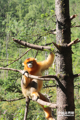 神農(nóng)架大龍?zhí)稐⒅鸾z猴部落。金絲猴是中國特有的靈長類動物,屬國家一級保護動物。神農(nóng)架金絲猴原定為川金絲猴亞種,現(xiàn)經(jīng)專家確定為神農(nóng)架獨有種群。(中國臺灣網(wǎng) 李杰 攝)