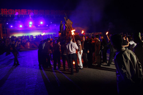 在篝火晚會現(xiàn)場,蒙古族勇士表演打樹花,將1600度的鐵水潑向天空,形成美麗的火花(中國臺灣網(wǎng) 蕪同 攝)
