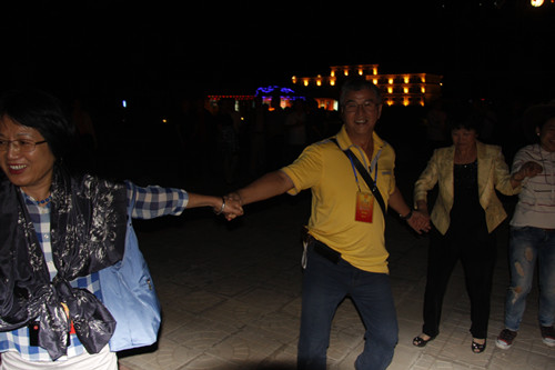 在篝火晚會上,臺灣嘉賓們歡快地跳起了舞(中國臺灣網(wǎng) 蕪同 攝)