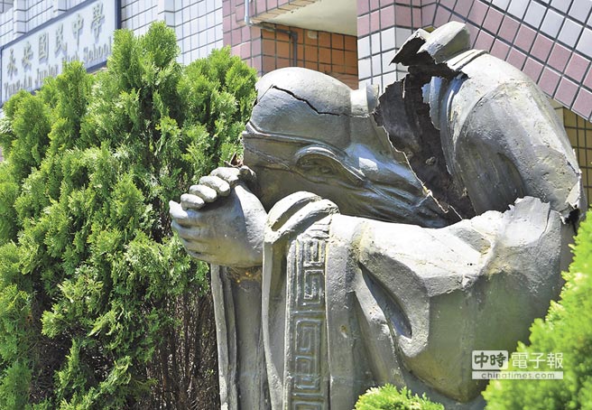 校方14日接獲通報(bào),返回校園清查財(cái)產(chǎn)損失,發(fā)現(xiàn)大面積鐵皮落于大門川堂前,20棵包含椰子樹、黑板樹等遭鐵皮壓垮。矗立校園的孔子雕像慘遭斷頭,手上還詭異地捧著頭顱。
