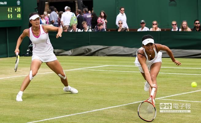 2013年溫布爾登網(wǎng)球賽上,彭帥、謝淑薇搭檔的“海峽組合”,一路殺進(jìn)決賽,并最終取得冠軍。(圖片來源:臺(tái)灣《中國(guó)時(shí)報(bào)》)