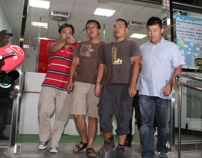 楊儒門(右2),18日傍晚與1名友人涉嫌在馬英九辦公室前潑油漆。臺(tái)灣警方獲報(bào)后將他們帶回警局偵訊,晚間9時(shí)15分左右移送。(圖片來自臺(tái)媒)